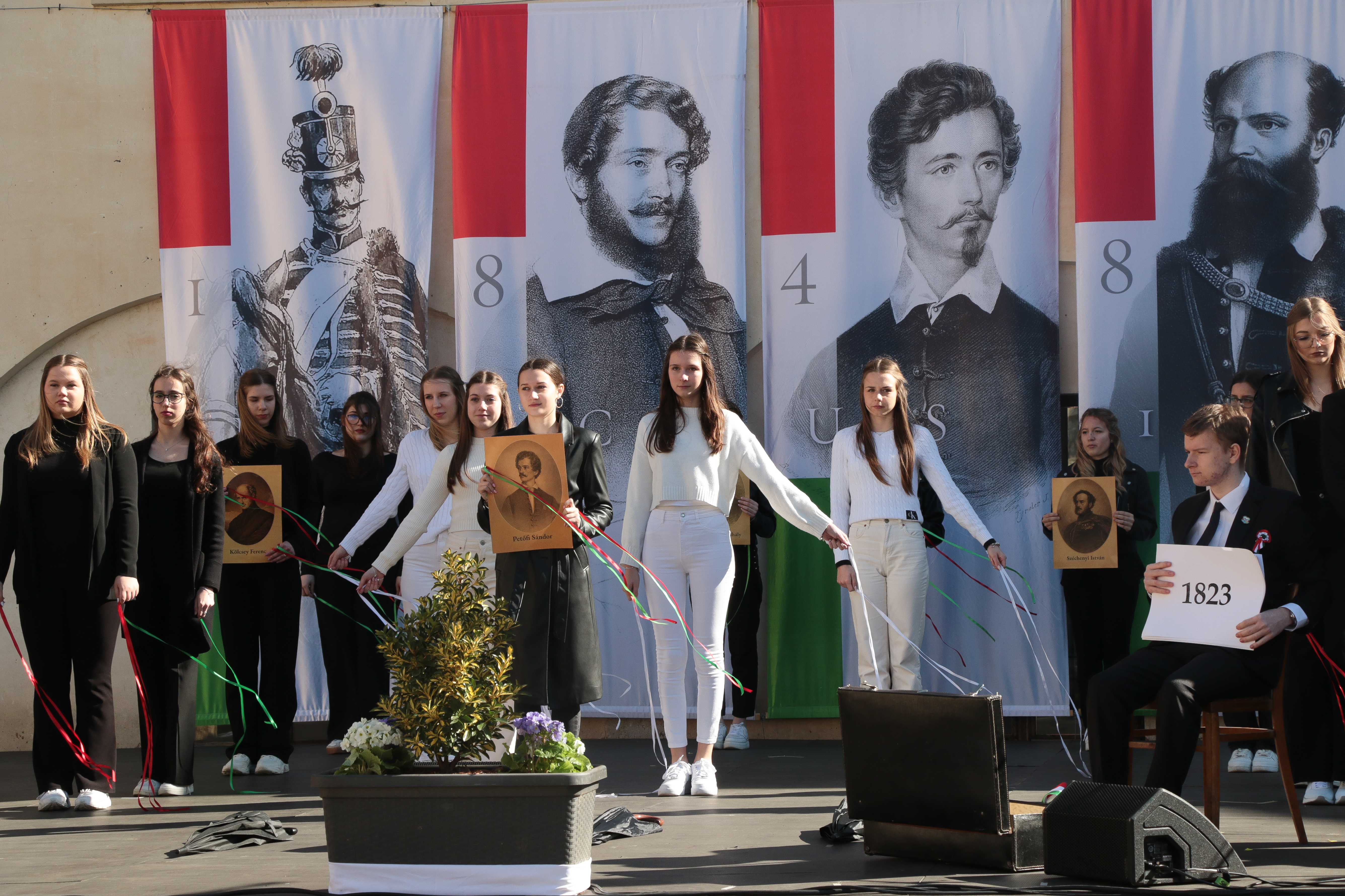A műsorban megidéztük a szabadság felé törekvő nagy reformkori gondolatokat, Petőfi szerelmre és szabadságra vágyó lelkét és végül a forradalmi nap ujjongó, tiszta, lelkesült pillanatát.