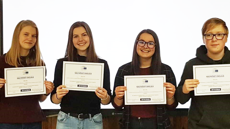 Junior Nagyköveteink két vetélkedőn is elindultak: az Euroscola témája az Európai Unió működése. Az országos online verseny díja az idén az utazások korlátozása miatt sajnos nem strasbourgi parlamenti látogatás volt, de tanulóink így is nagyon örültek az első öt helyezettnek járó ajándékcsomagnak. A csapat tagjai voltak: Bolla Lili, Biró Dorina, Horvát Lilla, Pup Dorina és Süle Csaba (valamennyien a 12.B osztály tanulói).