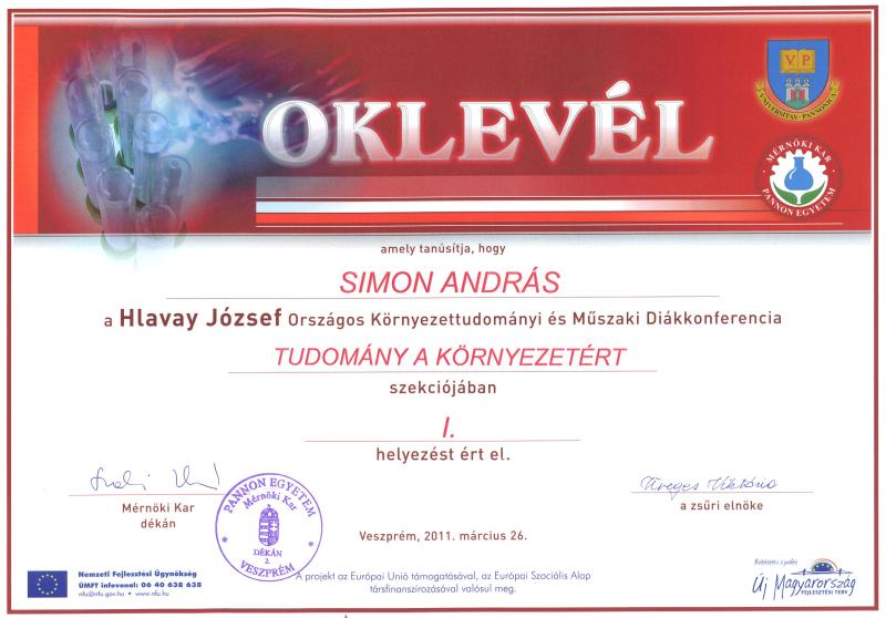 Simon András 11.B osztályos tanuló első helyezést ért el a Pannon Egyetem Mérnöki Karán Veszprémben megrendezett kutatódiákversenyen, a környezettudomány szekcióban