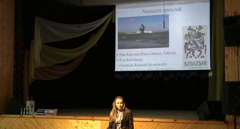 Többet tudhattunk meg az egyes népek nemzeti eposzairól is, mint a finn Kalevaláról, az észt Kalevipoegről és a mordvin Szijazsaról.Majd egy interaktív feladat következett, melyet mindnyájan nagyon élveztünk. A magyar szavakat azok finn és észt megfelelőivel kellett összepárosítanunk. Röviden kitért a nyelvtanra is, így a magyar és az észt igeragozásra, valamint a névszók esetrendszerére. Jó volt hallani, hogy nemcsak Magyarországon tanítanak észtet, hanem Észtországban is sokan tanulnak magyarul. Majd egy gyerekverssel és egy hanganyaggal szemléltette az észt nyelv dallamosságát.