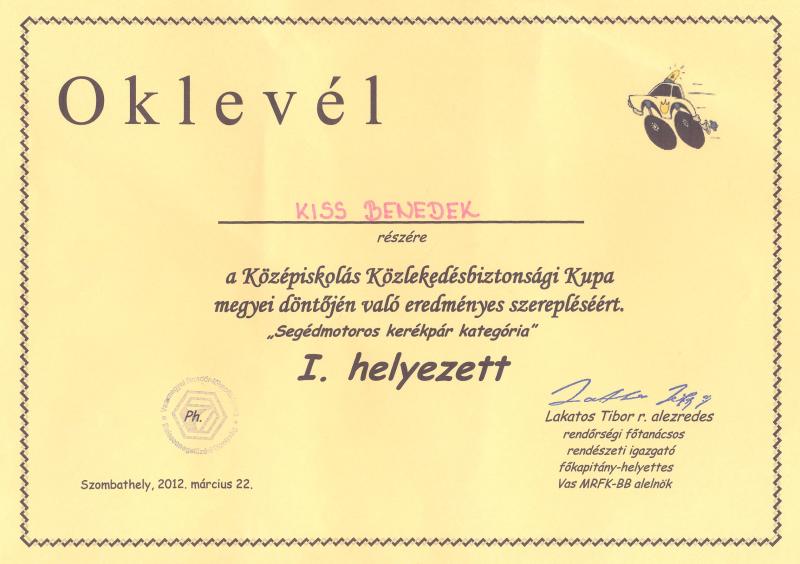 Kiss Benedek 12.A osztályos tanuló a Középiskolás Közlekedésbiztonsági Kupa megyei döntőjén Segédmotoros kerékpár kategóriában I. helyezést ért el.