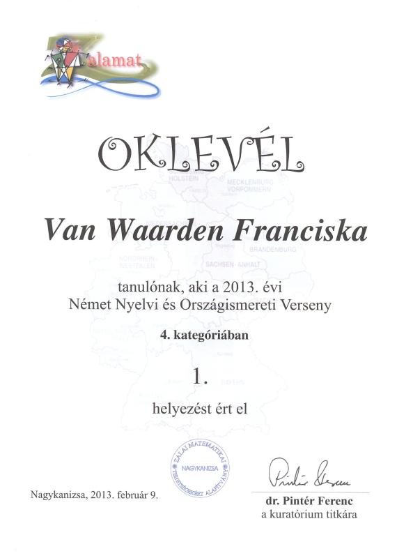 van Waarden Franciska9.B osztályos tanulóa Német Nyelvi és Országismereti Verseny4. kategóriájában1. helyezést ért el.Felkészítő tanára: Berkovits RitaGratulálunk mindkettejüknek! Pictures Címkék Idegen nyelvi munkaközösség 2013. február 11.