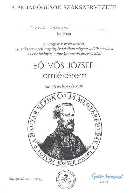 A Pedagógusok Szakszervezete Csikós Györgyné kollégát Eötvös József ezüst emlékérem kitüntetésben részesítette.