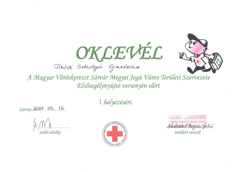 A Tinódi Sebestyén Gimnázium és Idegenforgalmi, Vendéglátói Szakképző Iskola csapata a Magyar Vöröskereszt által szervezett elsősegélynyújtó vetélkedő területi fordulóján 1., megyei fordulóján 4. helyezést ért el.