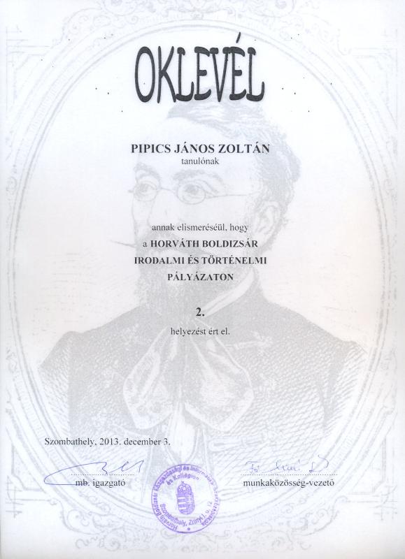 Horváth Boldizsár Közgazdasági és Informatikai Szakközépiskola által hirdetett irodalmi és történelmi pályázat
