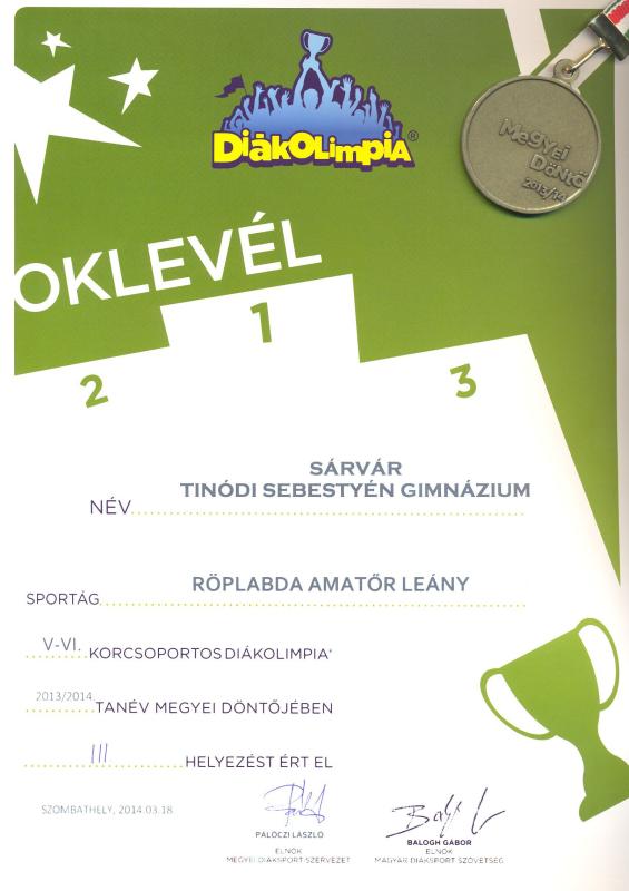 2014. március 18-án került megrendezésre az Amatőr Röplabda Diákolimpia megyei döntője Szombathelyen. A résztvevő V-VI. korcsoportos leány csapatok kuparendszerben, körmérkőzések formájában játszottak egymás ellen.
