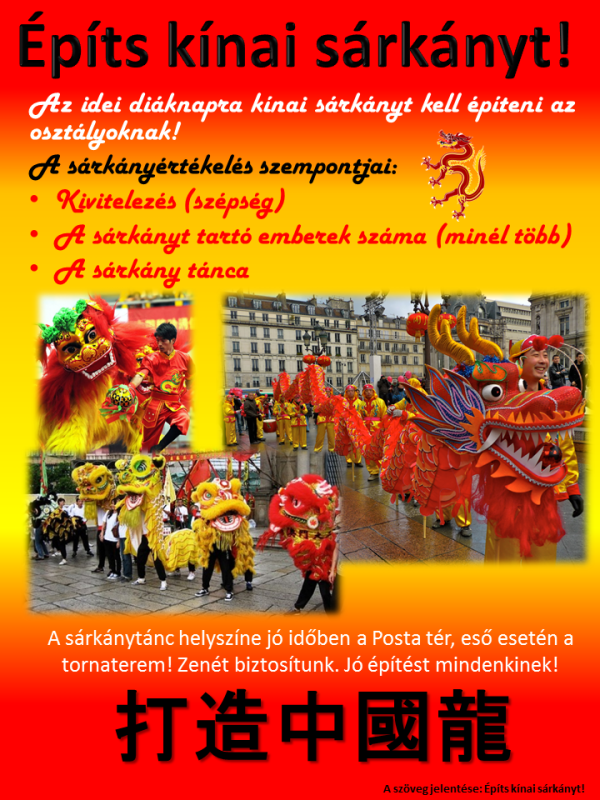 A versenyek után sárkányok lepték el a Posta teret. Az osztályok kreatív és felettébb látványos feladata az volt, hogy készítsenek kínai sárkányokat. A zsűri pontozta a sárkány szépségét, mozgását és azt is, hogy az osztályból hány ember alkotta. 15 óriási sárkány vonult fel és próbálta magát feltáncolni a dobogó legfelső fokára. Az eredményhirdetéskor kiderült, hogy a 12.A osztálynak sikerült is, hisz ők lettek a diáknap győztesei. Megkapták a vándortrófeát és a velejáró 20.000 Ft-ot is.