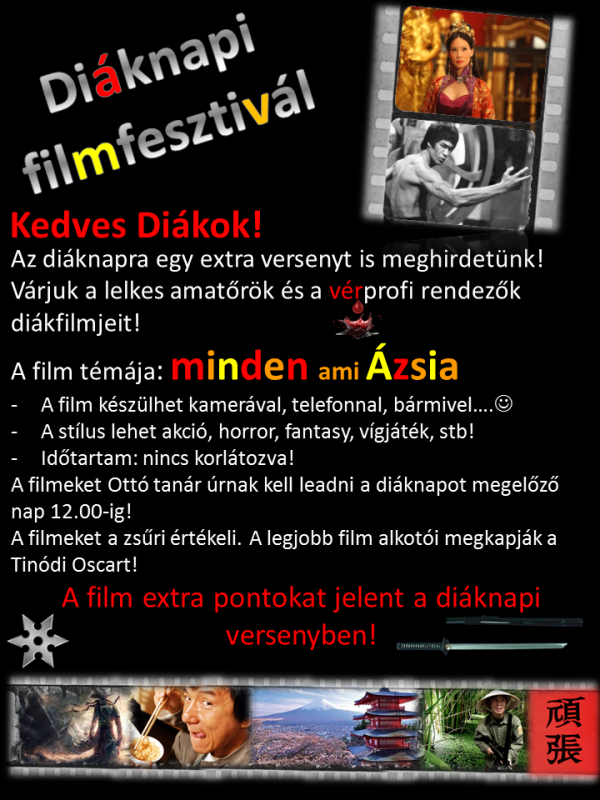 Az idei diáknap érdekessége volt, hogy plusz pontokért kisfilmet lehetett készíteni, természetesen a keleti kultúra jegyében. Itt szintén a 12.A osztály szerepelt a legjobban és Hajas András vehette át a Tinódi Oscart. Vígh Viktor tanár úr kihirdette a műveltségi verseny első 4 helyezettjét, a győztes a 11.B csapata lett. A nap a hagyományoknak megfelelően a tanári videóval zárult, mely idén is elnyerte a diákok tetszését. Este 18:00-tól 23:00-ig a buli remek befejezése volt a diáknapnak.
