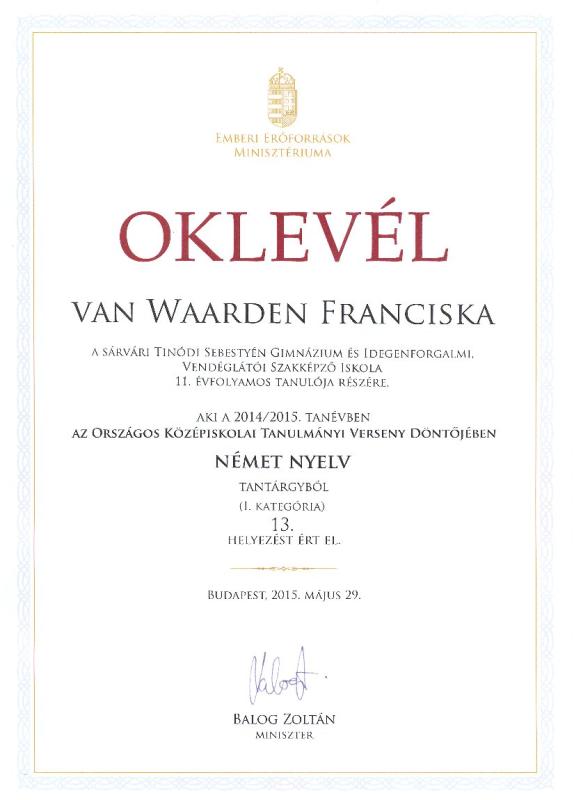 Iskolánk 11.B osztályos, kedves, szorgalmas és rendkívül tehetséges diákja, van Waarden Franciska „apa”- és anyanyelvén (holland és magyar) kívül az angol és a német nyelvet is nagyon magas szinten műveli. Az idegen nyelvek iránti érdeklődése, szeretete családi indíttatású: édesanyja és nagypapája is német nyelvtanár. Tudását az elmúlt évek során több nyelvi versenyen elért szép sikere is bizonyítja. Franciska német nyelvből az idei tanévben a tanulmányi versenyek közül a legrangosabbnak - és legnehezebbnek - számító, nagy múltra visszatekintő Országos Középiskolai Tanulmányi Verseny (OKTV) I. kategóriájában szerepelt kimagasló eredménnyel.