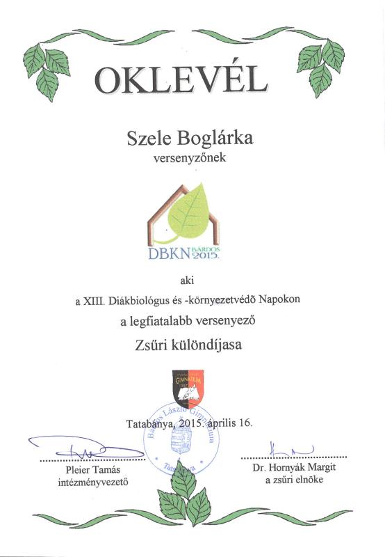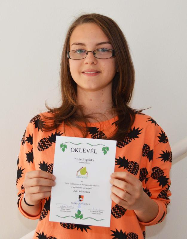 Szele Boglárka 9.A osztályos tanuló a tatabányai XIII. Diákbiológus és -környezetvédő Napokon az "Ebszemmel" című prezentációjáért a zsűri különdíjában részesült.