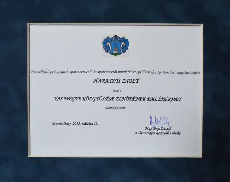 Haraszti Zsolt kiemelkedő pedagógusi, sportszervezői és sportvezetői munkájáért, példaértékű sportemberi magatartásáért VAS MEGYE KÖZGYŰLÉSE ELNÖKÉNEK EMLÉKÉRMÉT vehette át. Pictures Címkék Sport 2015. március 13.