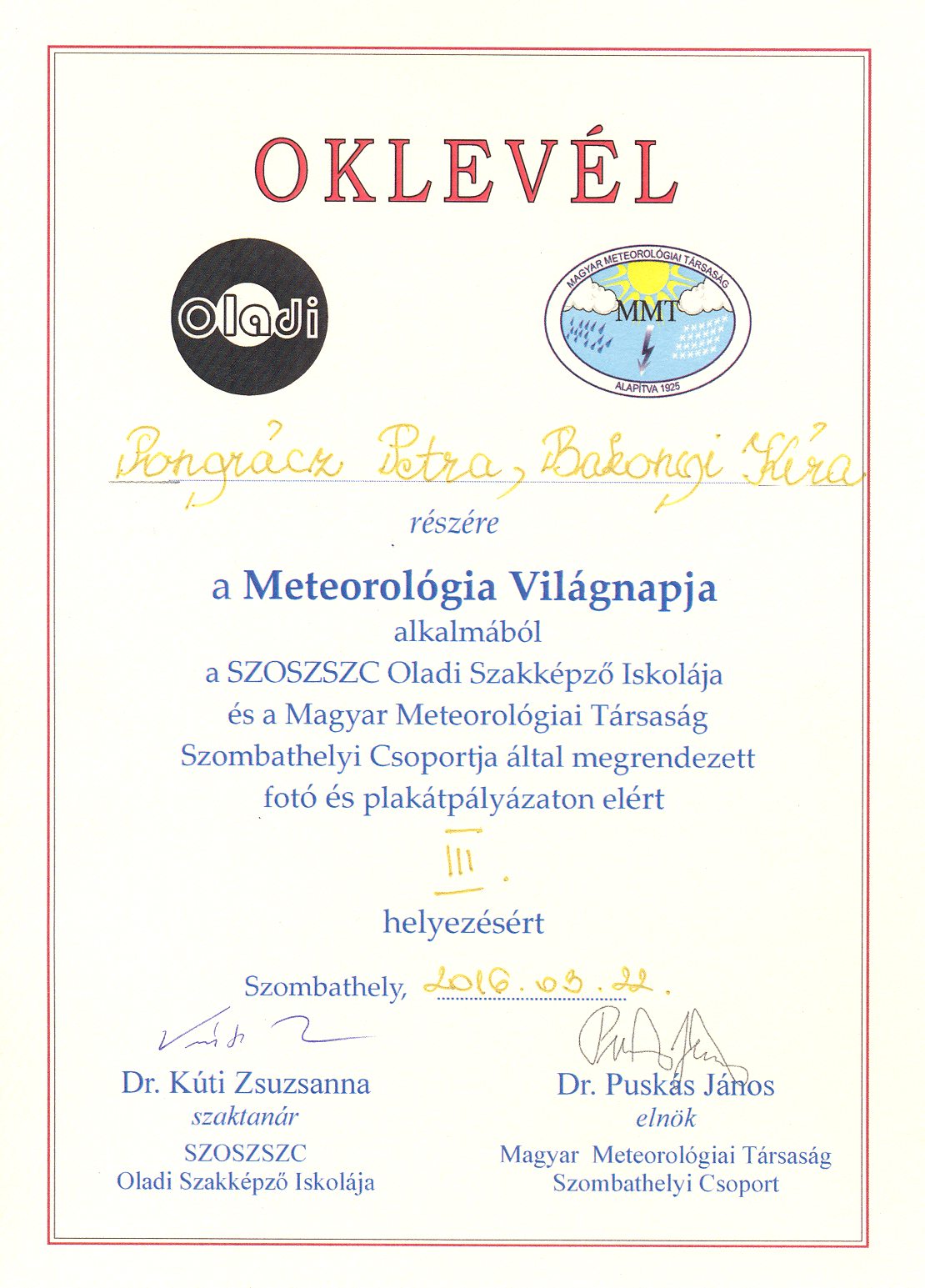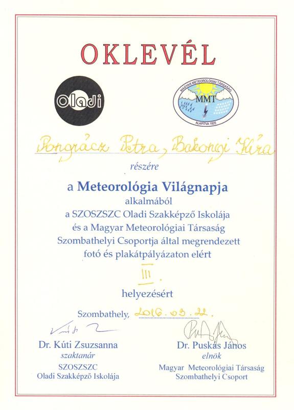 Pongrácz Petra és Bakonyi Kíra 9.D osztályos tanulók a Meteorológia Világnapja alkalmából megrendezett fotó és plakátpályázaton 3. helyezést értek el.Felkészítő tanár: Grodvaltné Martos Veronika Pictures Címkék Humán munkaközösség 2016. március 22.
