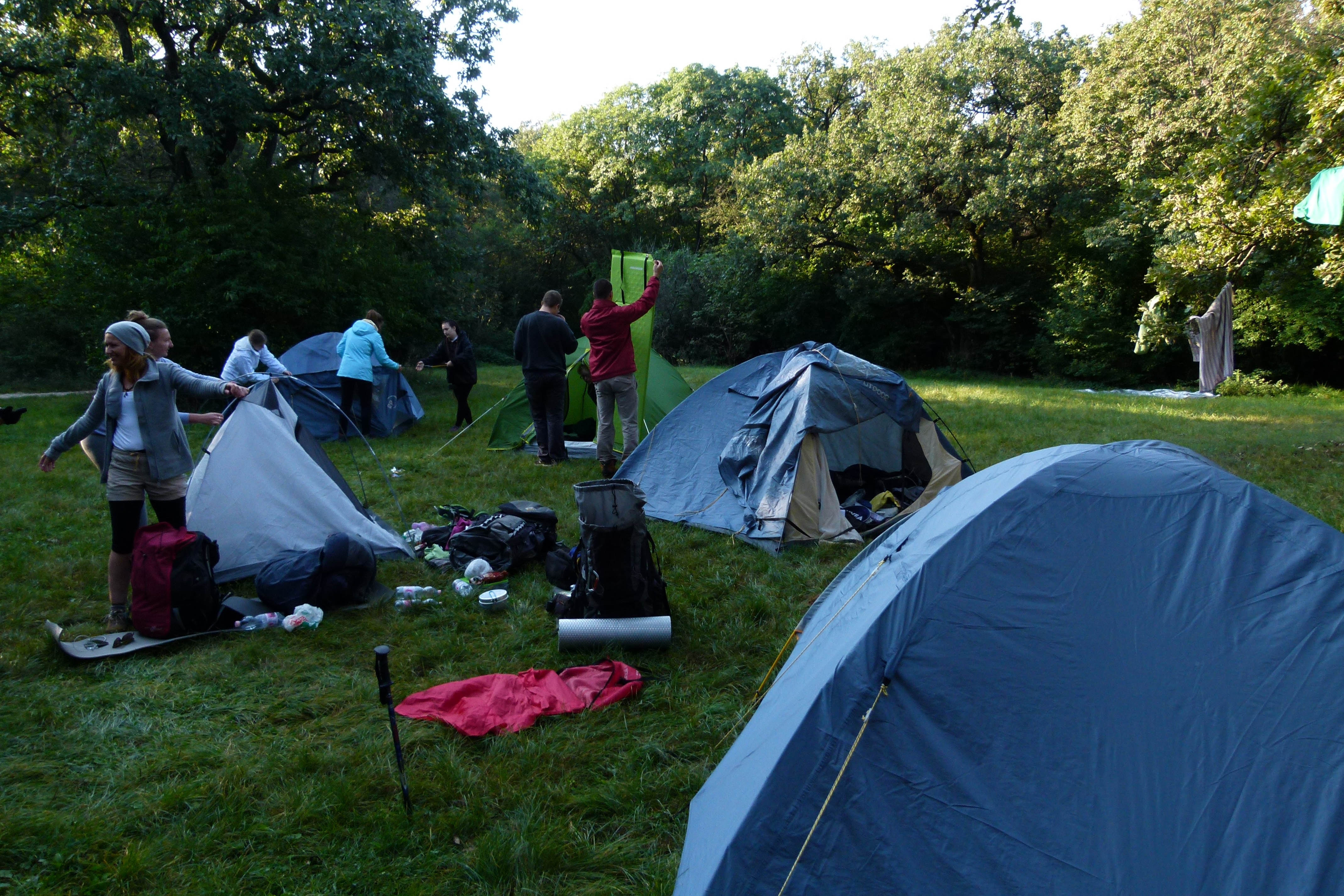 Bár Tatabánya nem szép város, az elhelyezkedésére pont az ellenkezője igaz. A hófehér mészkőből álló Kő-hegy és a rajta álló óriási Turul-szobor már messziről vonzza az ember szemét. És ha valaki feljut a szoborhoz, csodálatos panorámát láthat, a várost körbeölelő táj szemet gyönyörködtető. Mindig is szerettem volna itt aludni és elkészíteni a város éjszakai fényképét! A szálláshelyül választott mező nagyon kulturált volt, padokkal, tűzrakókkal. A tizenhárom sátorból álló táborunk látványa reggel tiszteletet parancsoló tömeghatást keltett.