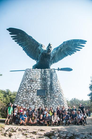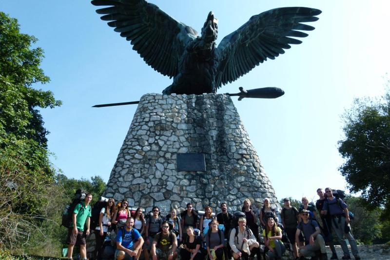 Péntek délután öt órára már fel is dobtuk magunkat a tatabányai Turul-szoborhoz. (Feldobtuk alatt értsd: nagyhátizsákkal izomból felmásztunk a hegyre úgy, hogy mindenkiről folyt a verejték). A csapat itt három részre vált. Az első csoportnak gyorstalpalós tanfolyamot tartottunk Nagy Jácinttal (fotós, ipari alpinista, majdnem földrajz tanár) arról, hogy hogyan kell a via ferrata útvonalakon a kapott felszereléssel mászni. Mihelyst ez megtörtént, a bátor vállalkozók el is indultak a legkönnyebb útvonalon, amely mint utólag kiderült nem is volt annyira egyszerű. A második egység elment megnézni a Ranzinger Vince kilátót. A maradék túrázók vigyáztak a csomagokra és pihengettek. Később váltottunk, így aki nem látta a kilátót még, most az is megnézhette.