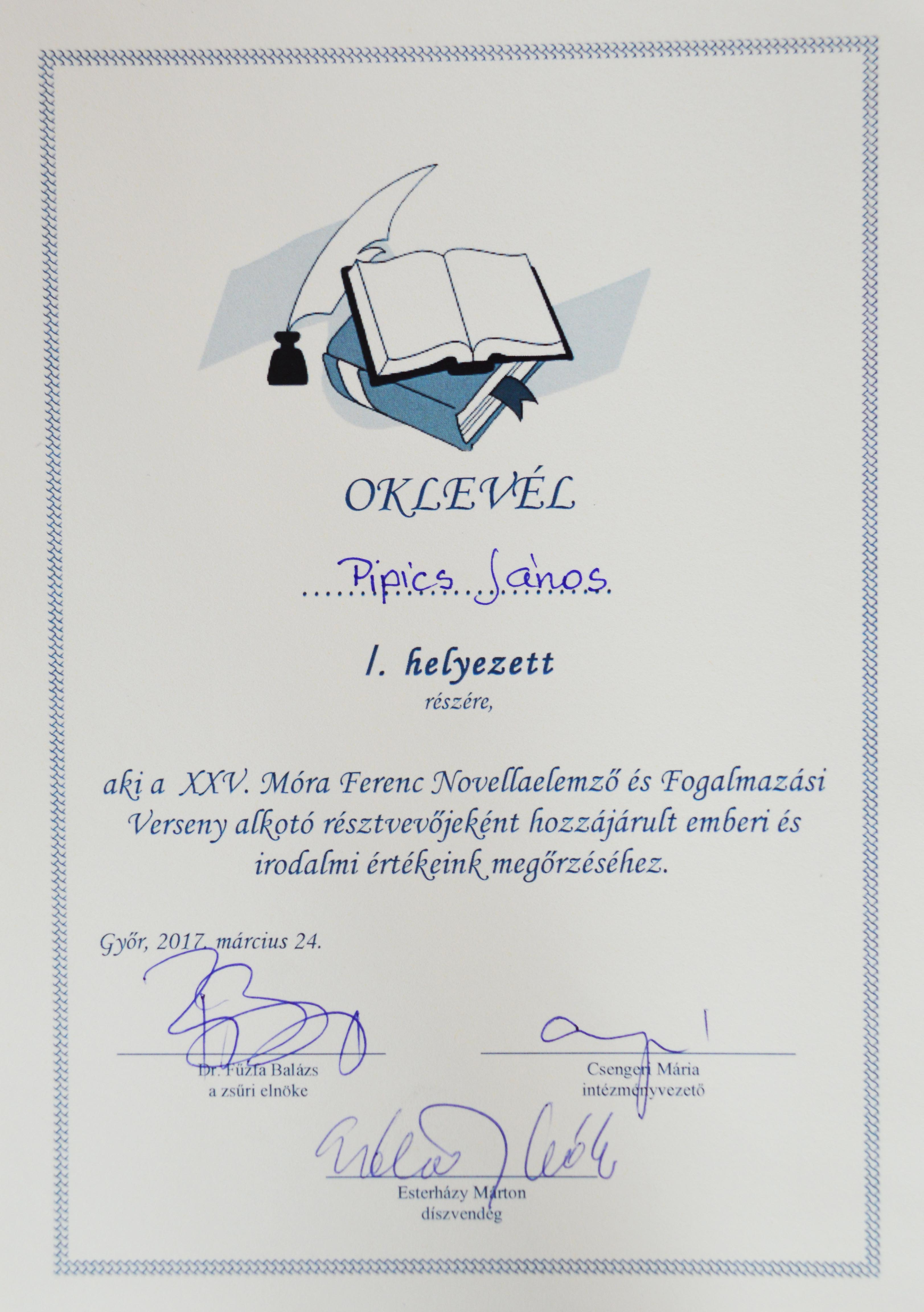 2017. március 24-én Pipics János 12.B osztályos tanuló a XXV. Móra Ferenc Novellaelemző és Fogalmazási Versenyen 1. helyezést ért el. Gratulálunk nagyszerű eredményéhez!