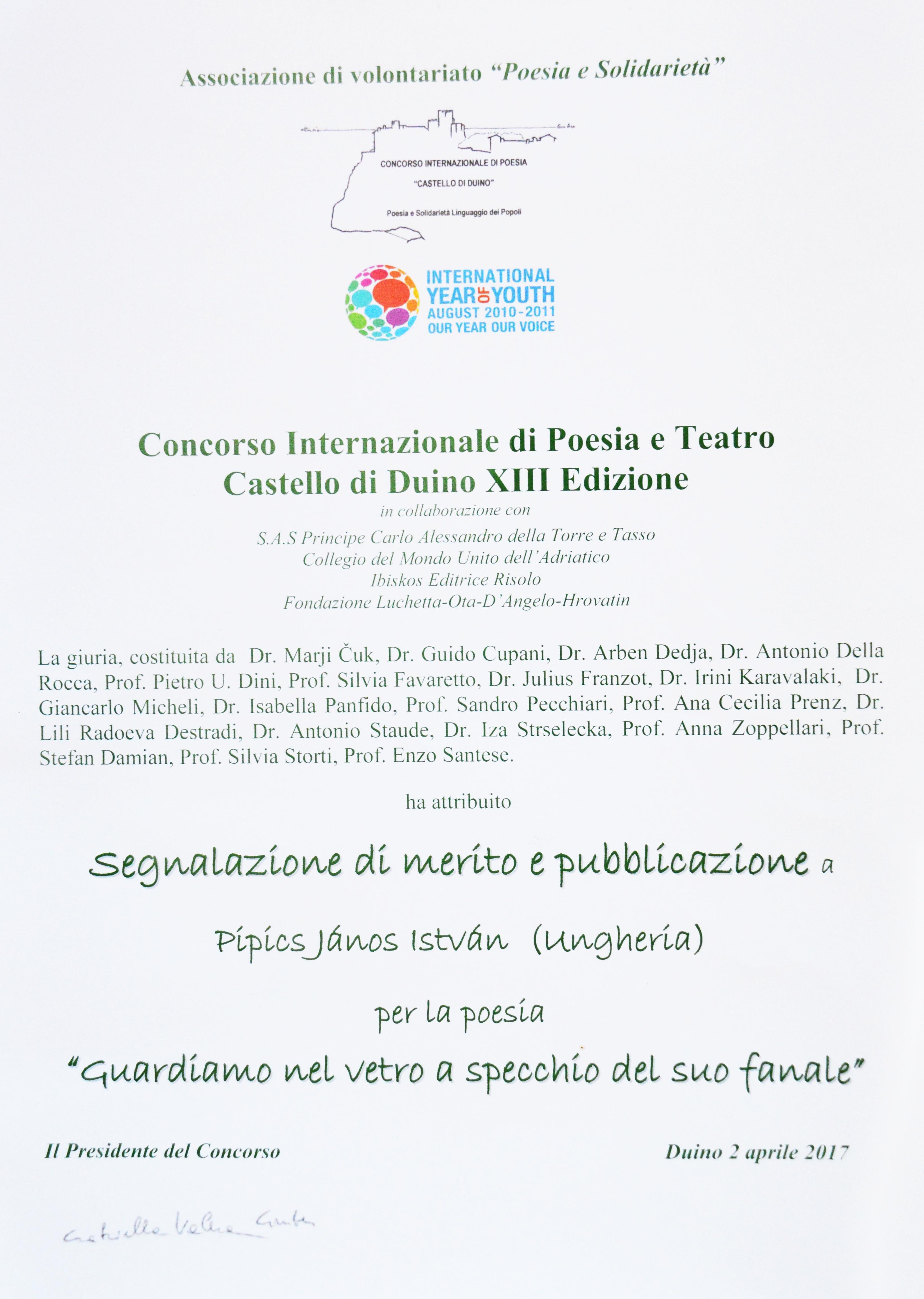A Castello di Duino Nemzetközi Költészeti és Színházi verseny egy harminc év alatti szerzők számára évente kiírt rangos megmérettetés, amit a trieszti egyetem és az UNESCO is támogat. Fő szervezői: Gabriella és Ottavio Gruber, egy olasz házaspár, akik már évek óta munkálkodnak a költészet közösségépítő erejének növelésén. A két kategóriánál nemcsak a feladat más, hanem a pályázat benyújtásának módja is. Amíg a kiadatlan verseknél a pályaművet a szerző anyanyelvén kell beküldeni egy jó minőségű angol fordítással, és ezek alapján dönt a zsűri, addig a jeleneteknél az angol mellett olaszra is át kell ültetni az írást, hisz azt olvassák el a pályázatok elbírálói.