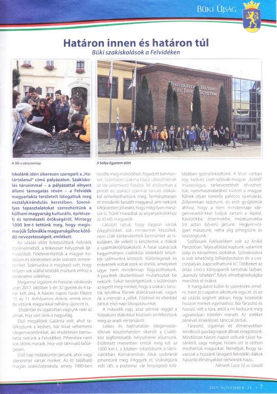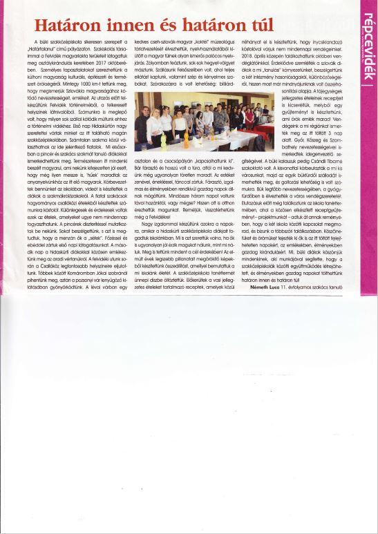 Iskolánk idén sikeresen szerepelt a „Határtalanul” című pályázaton. Szakközépiskolás társaimmal – a pályázaton elnyert állami támogatás révén – a Felvidék magyarlakta területeit látogattuk meg osztálykirándulás keretében. Személyes tapasztalatokat szerezhettünk a külhoni magyarság kulturális, építészeti és természeti örökségéről. Mintegy 1000 km-t tettünk meg, hogy megismerjük Szlovákia magyarságához kötődő nevezetességeit, emlékeit.