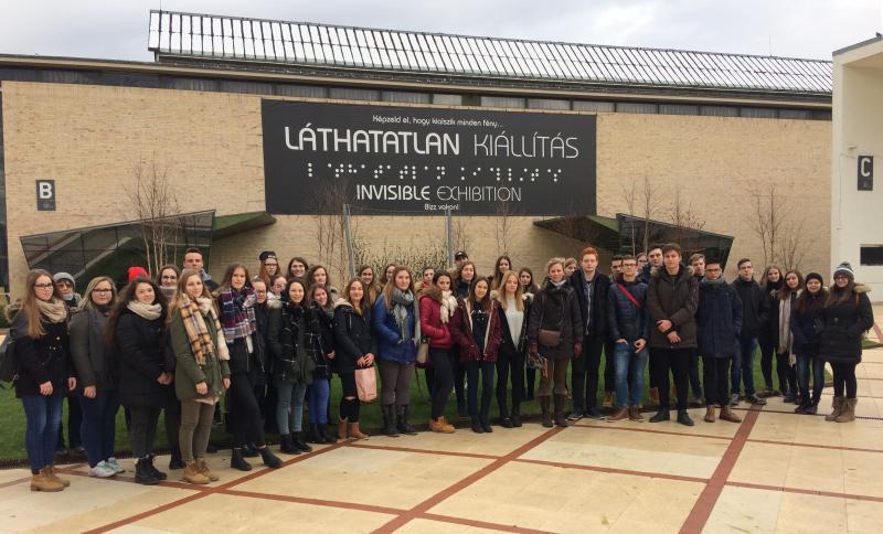 2017. december 15-én több mint ötven diákkal látogattunk el Budapestre. A 11. évfolyam tanulóiból szervezett csoporttal először a Láthatatlan kiállítás helyszínére igyekeztünk. A kiállítás számunkra, látók számára egy érdekes élmény, különleges játszóház, ahol egy órán keresztül teljes sötétségben tapogatózunk.
