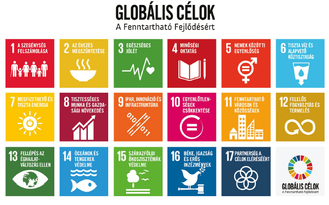 A Globális Célok a fenntartható fejlődést szolgálják és a társadalom kiemelt problémáira kívánnak megoldást nyújtani. Ezek a következők: a szegénység felszámolása, az éhezés megszüntetése, egészség és jóllét, minőségi oktatás, nemek közötti egyenlőség, tiszta víz és alapvető köztisztaság, megfizethető és tiszta energia, tisztességes munka és gazdasági növekedés, ipar, innováció és infrastruktúra, egyenlőtlenségek csökkentése, fenntartható városok és közösségek, felelős fogyasztás és termelés, fellépés az éghajlatváltozás ellen, óceánok és tengerek védelme, szárazföldi ökoszisztémák védelme, béke, igazság és erős intézmények.
