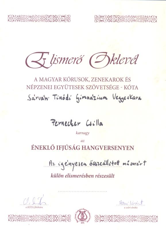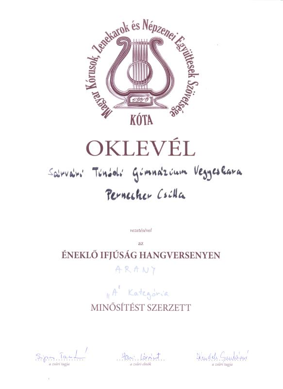 Iskolánk vegyeskara Pernecker Csilla vezetésével az Éneklő Ifjúság hangversenyen ARANY "A" Kategória minősítést szerzett.Pernecker Csilla karnagy az Éneklő Ifjúság hangversenyen "Az igényesen összeállított műsorért" külön elismerésben részesült. Pictures Címkék Humán munkaközösség 2018. április 23.