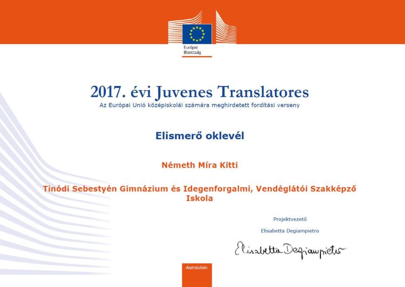 A Juvenes Translatores egy Európai Unió által meghirdetett fordítási verseny, melyen iskolánkból ebben a tanévben 5 tanuló indult. Mindannyian angolról magyar nyelvre fordítottak. Országonként csak egy nyertes diákot választhatnak ki a szervezők, de Németh Míra 11.B osztályos tanuló fordítása is kiemelkedően ügyes munkának bizonyult, ezért teljesítményéért elismerő oklevelet kapott. Idézet a bírálóktól: