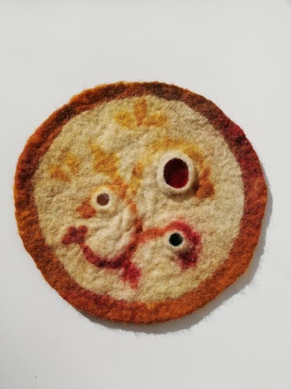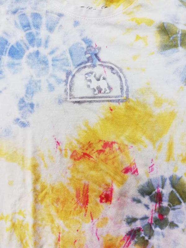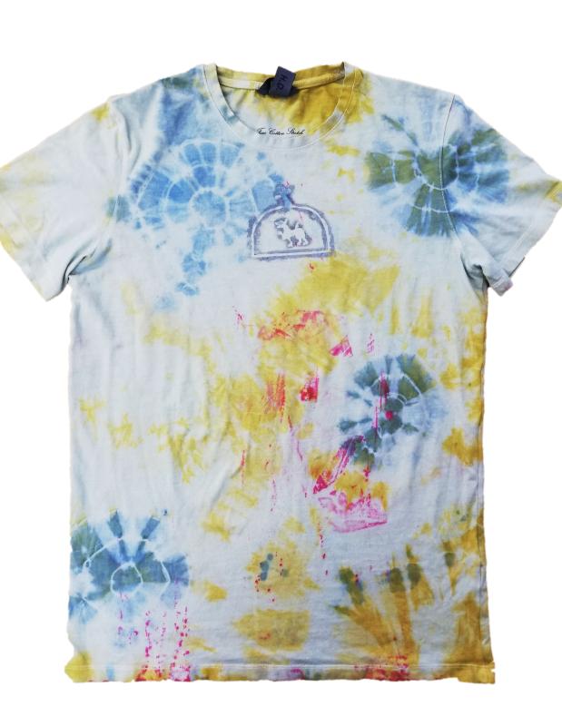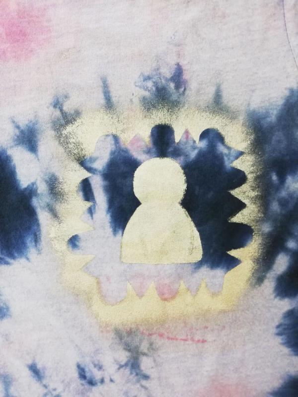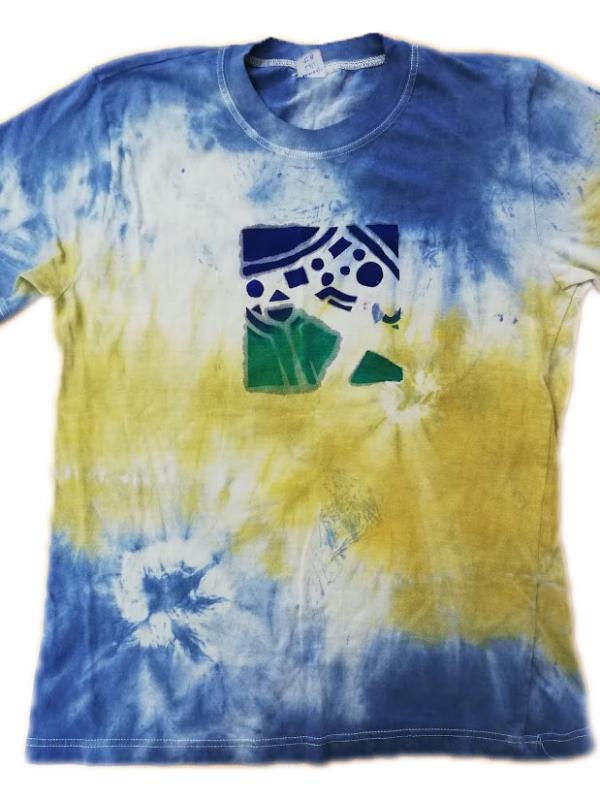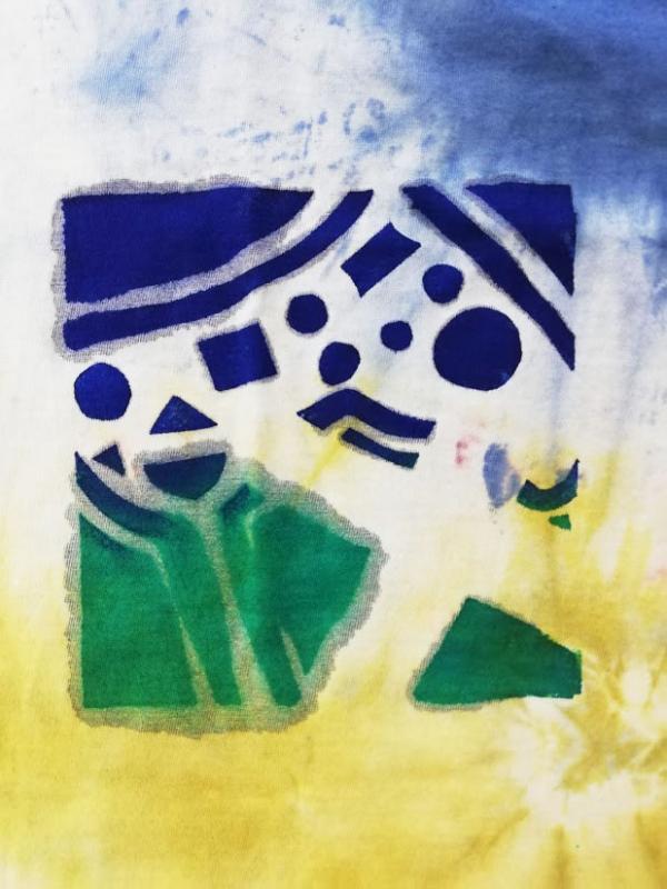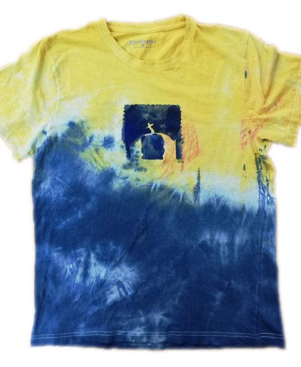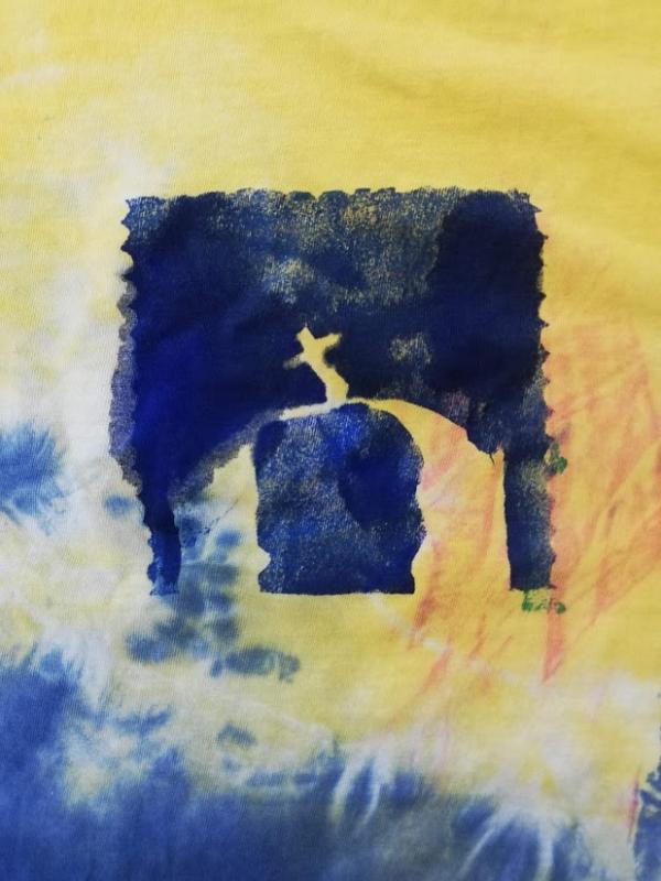 Toldi Adél Jelenés A textilfestés folyamata csak részben volt irányított, a kialakult kép spontán. A színek kissé kavargó, kék sárga kontrasztja egyszerre vidám és elgondolkodtató. A Korona tetején imbolygó kereszt, mint egy kérdőjel hajlik az égnek. textil, textilfesték |   |