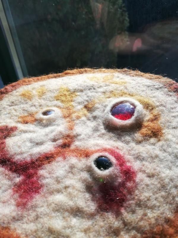 Szaksz Dorka Ölelő-olvasztó A textilképen a korona motívumai színekké és formákká olvadnak össze egy körforgásszerű egyesülésben. A természetes anyagok és az üveg együttes alkalmazásában ráismerhetünk a korona ékköveire, vagy a magyar lobogó színeire. textil, kártolt gyapjú, üveg |