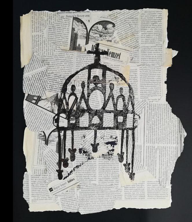 Szabó Gréta Anna Nyomás és lenyomat A nyomás kifejezés és a műben alkalmazott technika utalhat a nemzetünk hányattatott sorsára. A szétszabdalt, múltbéli papírlapok adta alap a sokféle hírre, napi történésre, ami aztán múlttá vált. A Szent Korona mint egy templomszerű boltozat lebeg a kép közepén, a körülötte feltűnő kép részletei egy hármas trtiptichont idéznek meg, ami akár nemzeti imánk imádságra hívó oltára is lehetne. montázs, újságpapír, ragasztó, saját készítésű nyomódúc |  |