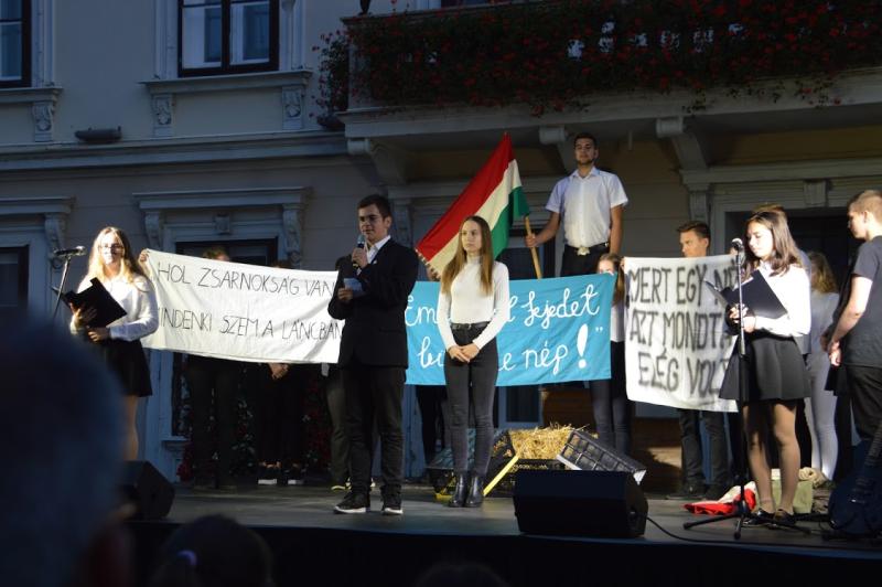 Iskolai előadásunk után mentünk a Kossuth térre, hiszen másnap ott volt jelenésünk. Megnéztük, hogy hogyan tudunk megoldani bizonyos jeleneteket, illetve a kellékek felhozatalát. Szerdán – október 23-án – délután 4 órakor már gyülekeztünk a téren, majd egy gyors próba után pihentünk és beszélgettünk. 17.30-kor kezdődött az előadás. Mindenki izgult egy picit, hiszen most több, idegen ember előtt kellett szerepelnünk. Fellépésünk után is sok dicséretet kaptunk.