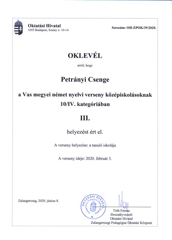 A Zalaegerszegi Pedagógiai Oktatási Központ által szervezett Vas megyei német nyelvi versenyen a szóbeli döntőbe jutottak az alábbi tanulóink. Írásbeli eredményük alapján: