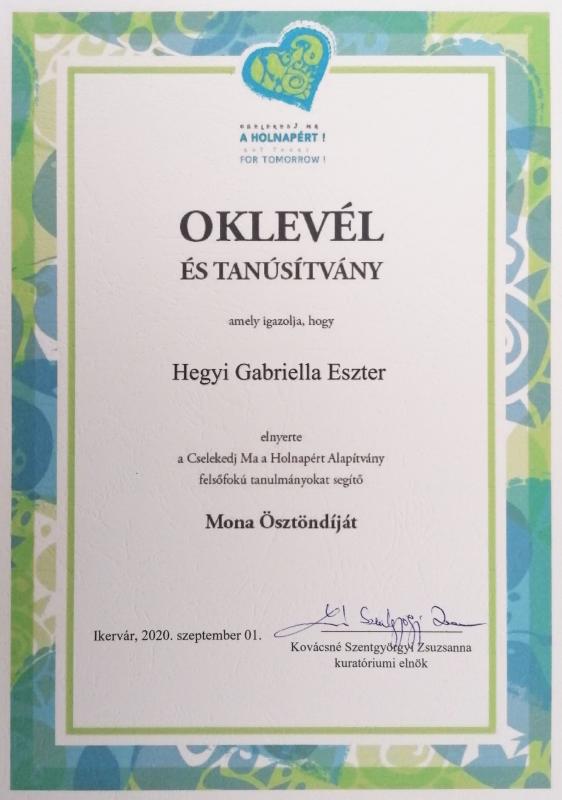 A 2020-21-es tanévtől Hegyi Gabriella tavaly érettségizett diákunk a Budapesti Gazdasági Egyetem Külkereskedelmi Karán folytatja tanulmányait nemzetközi gazdálkodás szakon. Gabi sikeres pályázatával elnyerte „A Cselekedj Ma a Holnapért Alapítvány” által meghirdetett "MONA" felsőfokú tanulmányokat segítő ösztöndíjat. Az egyetemista szeptembertől havi 50.000 forintos támogatást kap felsőfokú tanulmányai segítésére a képzés teljes időtartamára.