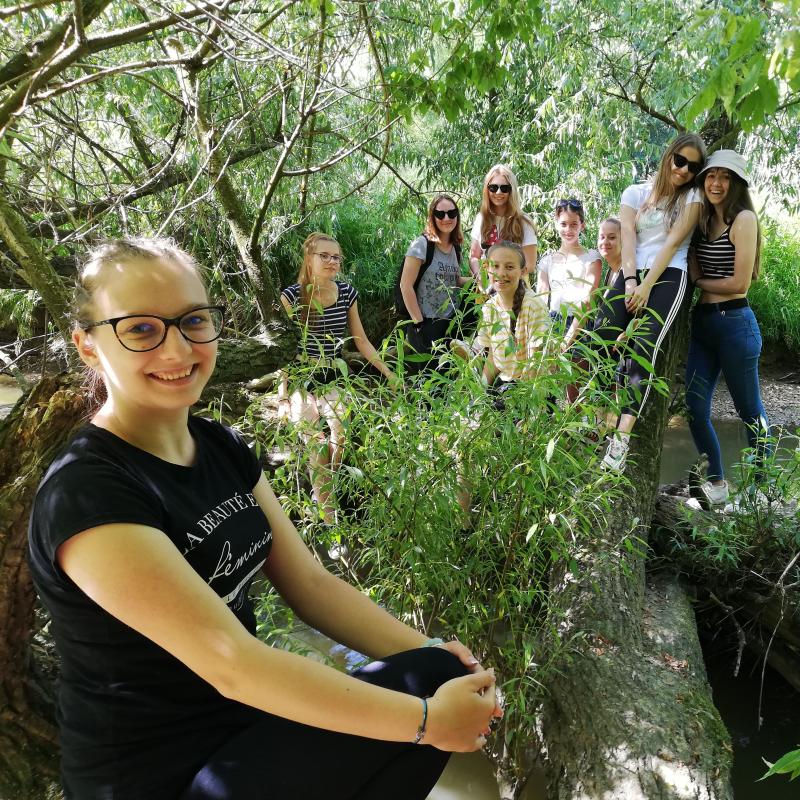 A gyalogtúrára gyorsan elfogytak a helyek, többségében 9-10 évfolyamos diákokkal indultunk útnak reggel. A várárok árnyas fái alatt lépegettünk, majd elhaladtunk Lakatos József Boldogasszony szobra mellett és nyugat felől kerültük meg a csótó nyugodt vizét. A futópályát bölcsen üresen hagytuk – két tinódis éppen el is húzott mellettünk – ők gondolom atlétikára jelentkeztek.