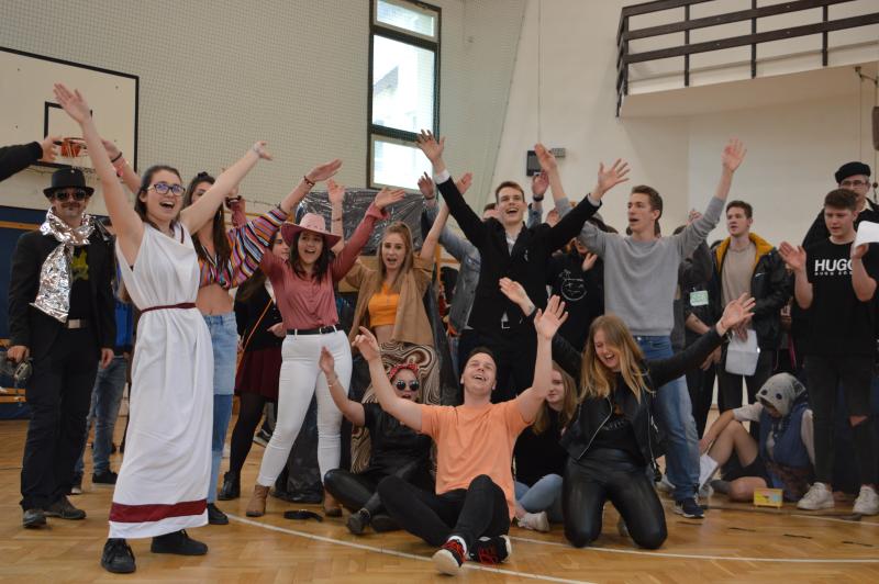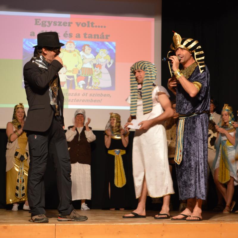 A délelőtt utolsó - és egyben legjobban várt programja - a tanári műsor volt: a díszterem színpadán tanáraink szórakoztattak bennünket vicces jelmezekben a csaknem egy órás időutazás során.