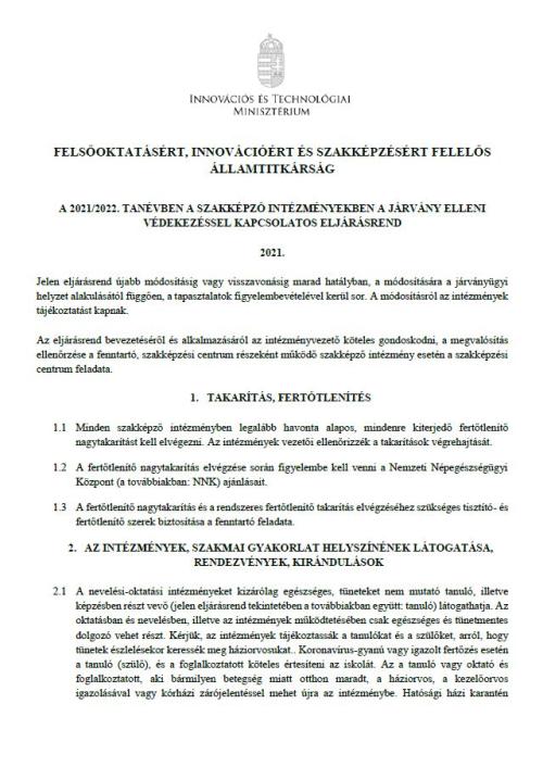 2021/2022. tanévben a szakképző intézményekben a járvány elleni védekezéssel kapcsolatos eljárásrend