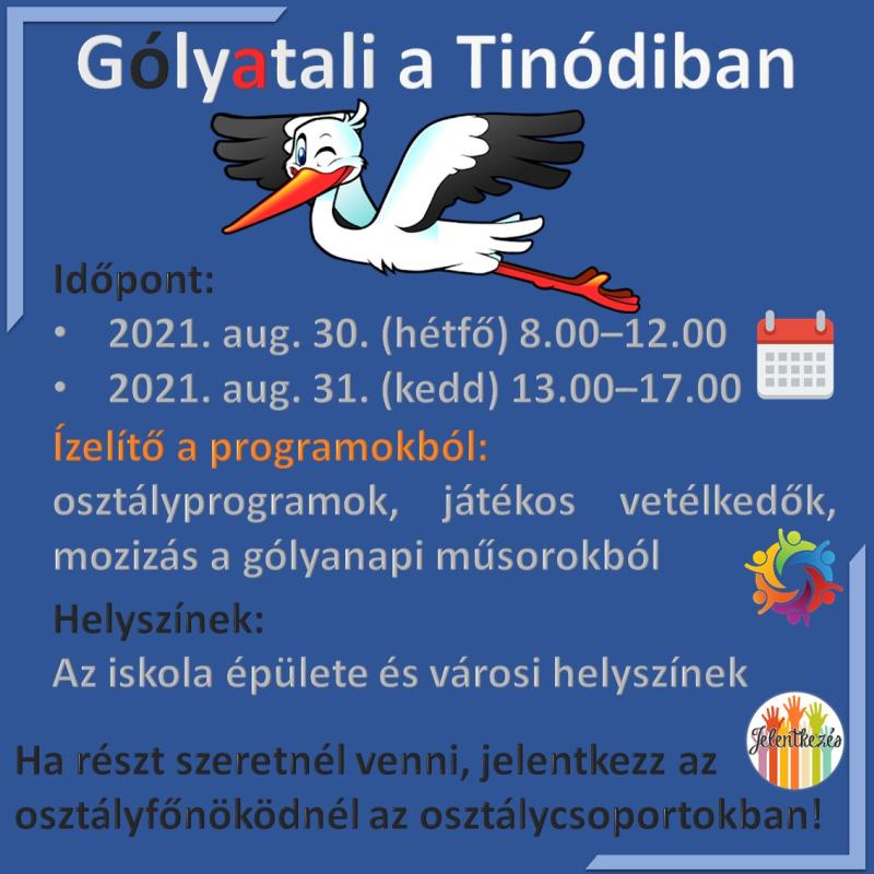 A gólyatali, vagyis a gólyák találkozója iskolánk hagyományos programjai közé tartozik. Szeretettel várunk Benneteket iskolánkba, és reméljük, hogy jól szórakoztok majd.