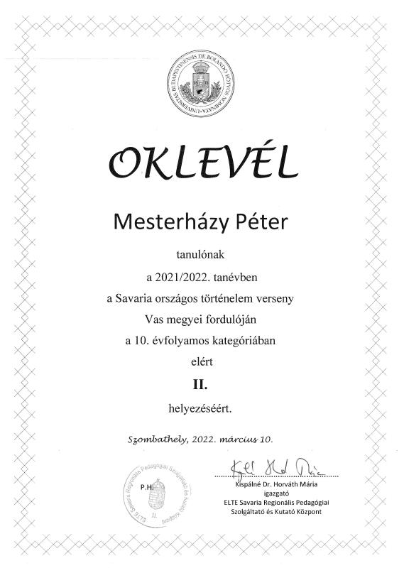 A Savaria országos történelem verseny megyei fordulóján a 10. évfolyam kategóriájábanMesterházy Péter 10.A osztályos tanuló 2. helyezést ért el.Felkészítő tanár: Dr. Hajdu TamásGratulálunk a versenyzőnek és felkészítő tanárának! Sok sikert kívánunk az országos döntőben való szerepléshez! Pictures Címkék Humán munkaközösség 2022. március 10.