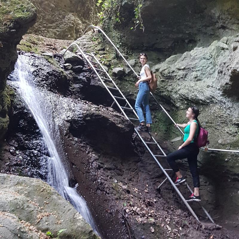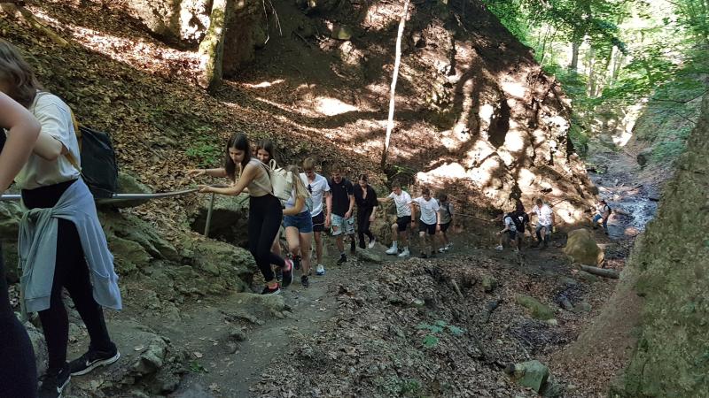 Ezután utunk Dömös felé vezetett, a Rám-szakadék megmászása következett. Kezdetét vette az esések, csúszások sorozata. Ekkor jöttek rá néhányan, hogy a vadonatúj fehér cipő nem volt a legmegfelelőbb választás ilyen helyre. Voltak, akik elöl törték az utat, s voltak, akik hátul húzták, tolták, segítették a másikat, próbálva behozni a lemaradást. A táj elképesztően gyönyörű volt, a madarak csicsergése és a patak csordogálása még hangulatosabbá tette a túrát. Fáradtan, kimerülten és persze jó koszosan értünk a szállásra, ahol először megkaptuk a vacsoránkat, majd kipakolás után készülődtünk a lefekvéshez.