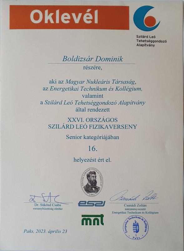 Április 21-23. között vettem részt az Országos Szilárd Leó Fizikaverseny döntőjében, amely a paksi Energetikai Technikumban került megrendezésre. Az ország különböző iskoláiból 20 versenyző jutott be a Senior kategóriába, ahol 16. helyen végeztem.