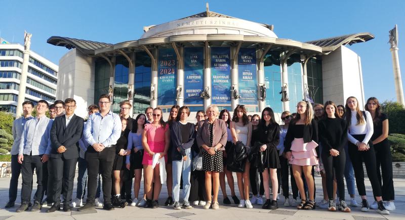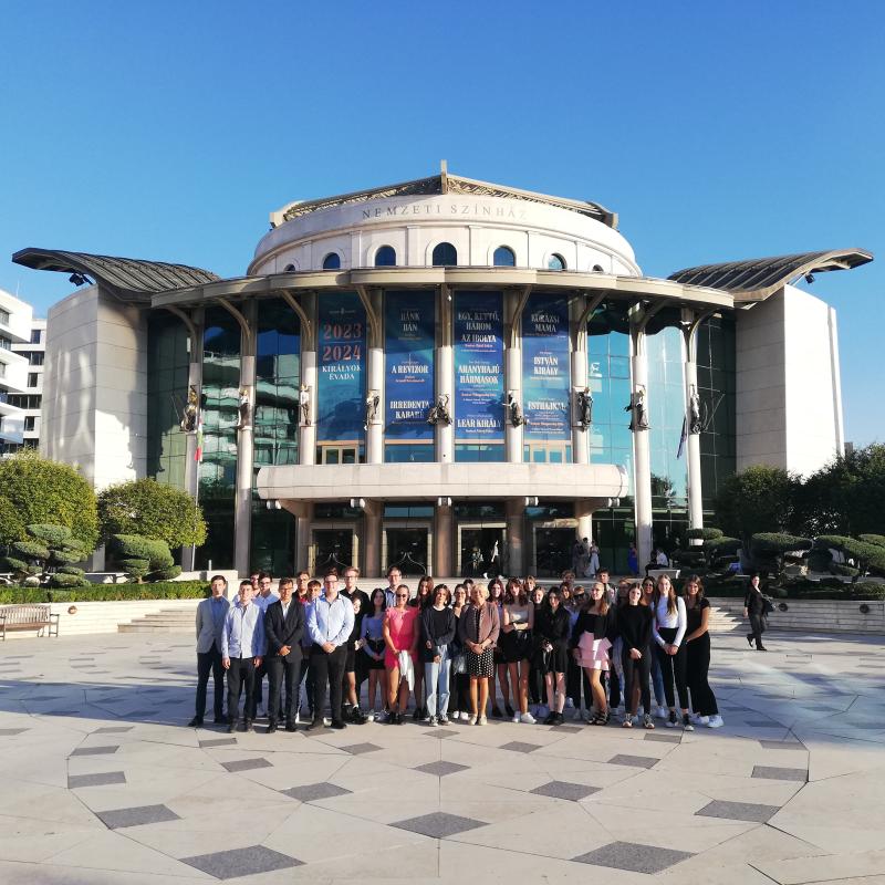 Ezt követően a Nemzeti Színházhoz érkeztünk, ahol újra gyönyörködhettünk a Dunára néző panorámában. Az előadás előtt még kitöltöttünk egy rövid kvízt, amelyben a Bánk Bán című művel kapcsolatos kérdésekre kellett válaszolunk.