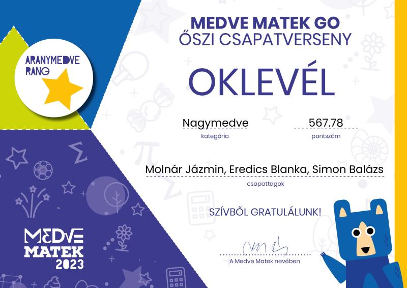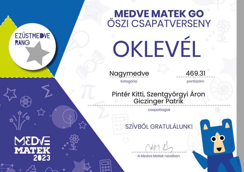 A Medve Matek GO Őszi Csapatversenyről a Szilvási András, Taizs Ádám, Molnár Lilien (10.A) alkotta csapat bejutott a 2024 júniusában megrendezésre kerülő országos döntőbe. (Nagymedve kategóriában Aranymedve rangot értek el.)