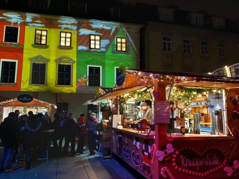 A pénteki zsúfolt forgalomnak és a borult időnek köszönhetően már sötétben érkeztünk meg Stájerország tartományi székhelyére. Az operától gyalog indultunk a főtérre a csodásan kivilágított Herrengassén. Útközben megcsodáltuk a Grazer Landhaus reneszánsz udvarán az életnagyságú bethlemi jászolt, amelyet egy finn jégszobrász 35 tonna jégből faragott és rengeteg helybelit és turistát vonz évről évre.