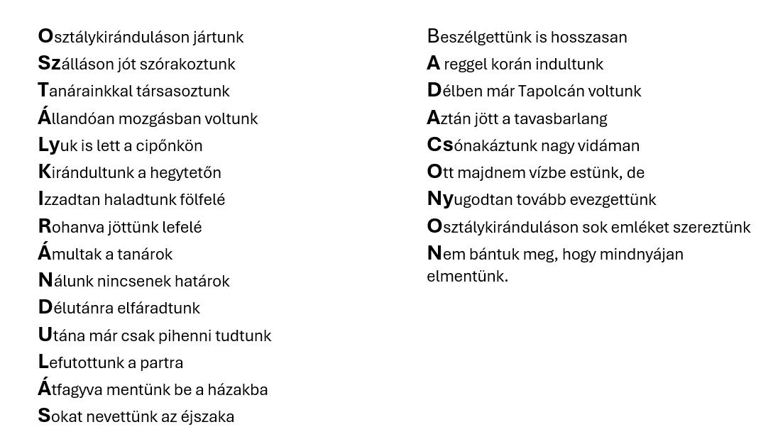 Élményeinket a mellékelt achrosztikonban foglaltuk össze.