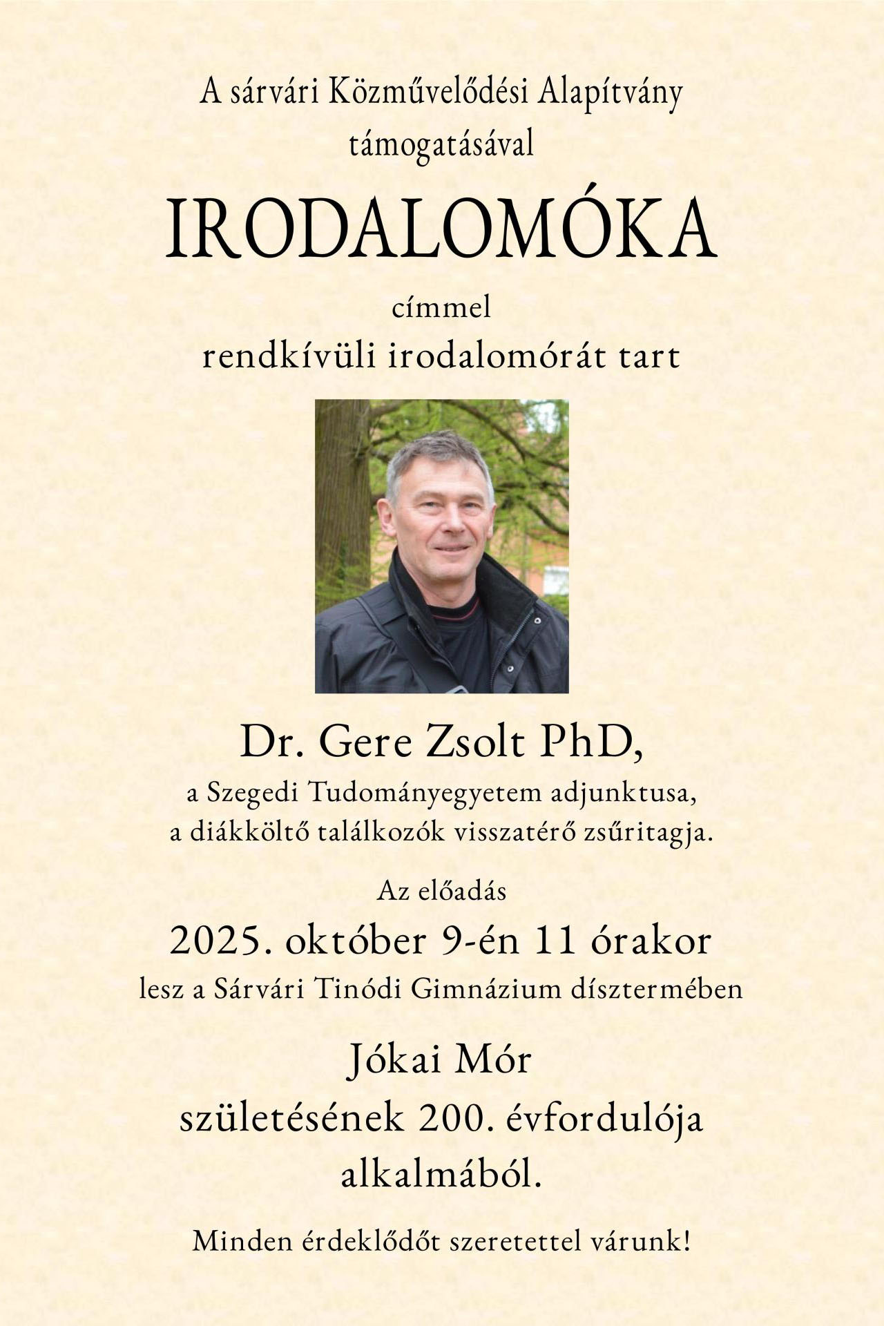 Dr. Gere Zsolt PhD a Szegedi Tudományegyetem adjunktusa, a diákírók, diákköltők találkozójának egykori nyertese, akinek kutatási területe a klasszikus magyar irodalom. Szebb idők és Vörösmarty Mihály emlékezete című kötetei alapművek Vörösmarty megismerésekor.