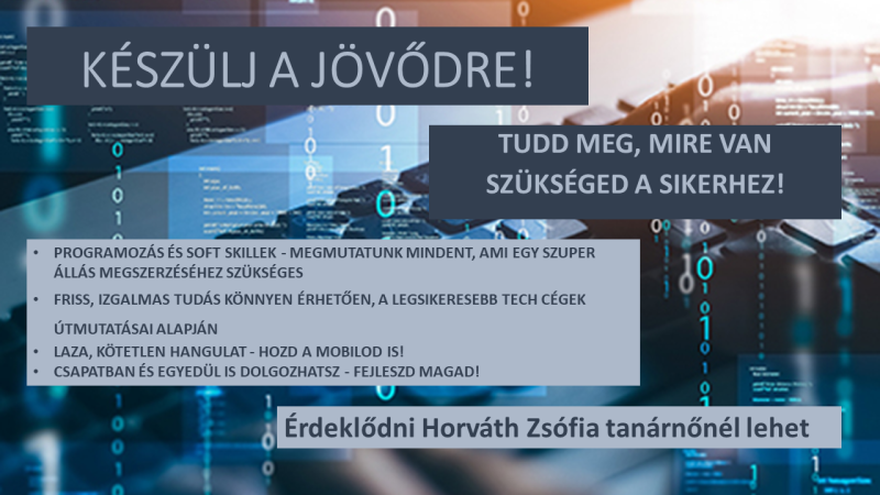 Iskolánk sikeresen pályázott az Unicredit projektjére, mely iskolánk két tanárának és 20–20 tanulójának részvételével valósul meg. A tanárok felkészítése online foglalkozások keretében már elkezdődött. Ezt szeptemberben helyszíni oktatás egészíti ki Budapesten. A tanulók felváltva vesznek részt soft skill és programozás órákon. Félévente 10–10 alkalommal egy-egy 45 perces foglalkozás lesz. A projektmunkát a tanulók saját prezentációjukkal fogják lezárni. Az oktatás mellett egy üzemlátogatáson is részt vesznek a tanulók, előreláthatólag Budapesten.