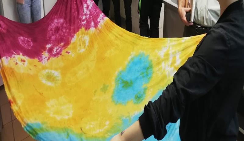A 10.C osztálynak a tanétterem és tankonyha megszokott környezet, de ezen az október végi szabadidős foglalkozáson olyat tettek, amit itt nem szoktak: batikoltak. A vizuális kultúra tantárgyat oktató tanár több nagy lepedődarabbal és madzaggal érkezett. A osztályfőnök is segített az előmunkálatokban. Megmutatta, illetve tanácsokkal támogatta a kötözések kialakítását. Néhány diák közben előkészítette a színező leveket: a tankonyha tűzhelyein forrt a víz és válogatták a színeket. A tanulók tanári segédlettel megkeresték az iskola legöregebb ruhaszárítóját, majd amikor minden készen állt, több ütemben mártogatták a közben felismerhetetlen formájúra csomózott anyagokat a hupiszínű levekbe. A végeredmény mindenkinek nagyon tetszett. A tevékenység elérte a célját: új készségeket fedeztek fel a tanulók egymásban és magunkban, valamint közben jól szórakoztak.
