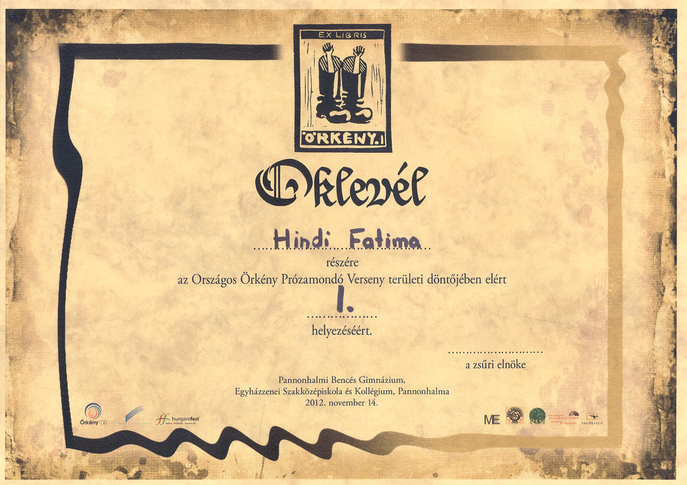 Hindi Fatima 13.A osztályos tanuló megnyerte az Országos Örkény Prózamondó Verseny területi fordulóját, az országos döntő 2012. november 26-án Budapesten lesz. Sok sikert kívánunk!