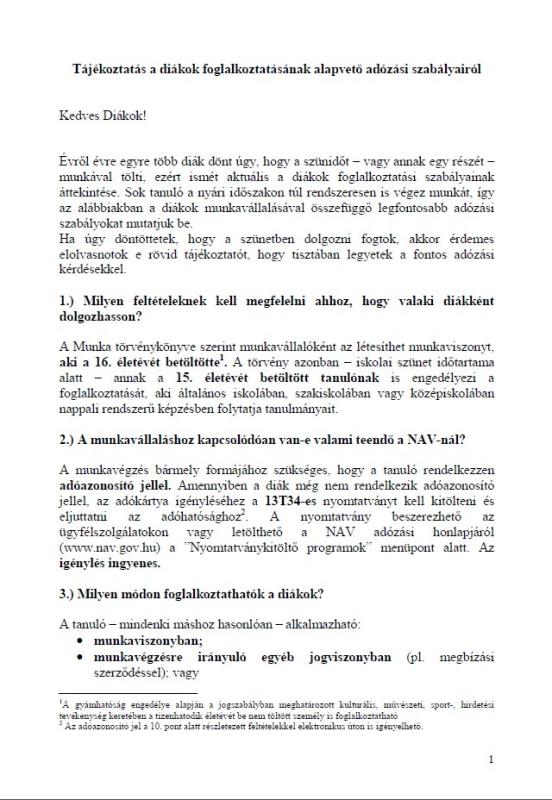 Tájékoztatás a diákok foglalkoztatásának alapvető adózási szabályairól