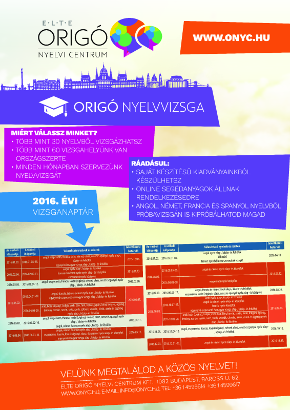 A vizsgaközpont 30 nyelvből kínál vizsgalehetőséget, angol és német nyelvből egyedülálló módon mind a 12 hónapban. Az Origó vizsgarendszer megbízhatóságának köszönhetően évek óta piacvezető hazánkban.