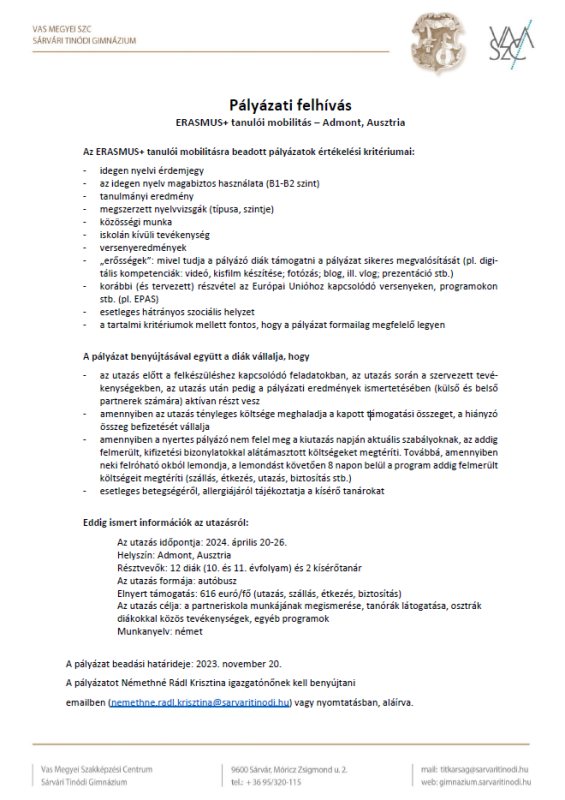 Erasmus+ mobilitási pályázat 2023-2024