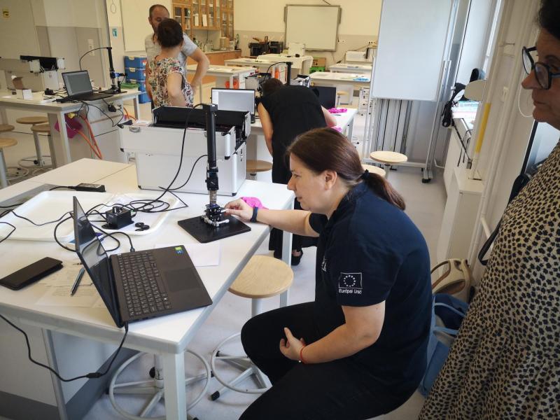 A Kecskeméti Piarista Iskola Selye János Diáklaborjában került sor az építésre és a metszetek vizsgálatára. A labor honlapján kínálja tanulócsoportoknak a foglalkozást: „A 3 alkalmas foglalkozás során csapatonként 1-1 fluoreszcens mikroszkópot építünk, miközben megismerjük ennek a különleges mikroszkópnak a működését. A mikroszkóp vizsgálatához megtanulunk különböző vizsgálandó mintákat előkészíteni. De az ide érkezőknek lehetősége lesz laborunk többi mikroszkópjának kipróbálására is.”